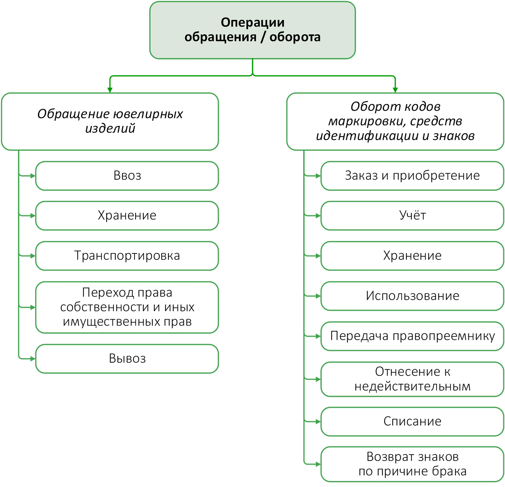 На каждом этапе обращения ювелирных изделий, а также оборота кодов маркировки, средств идентификации и знаков, могут осуществляться следующие операции: