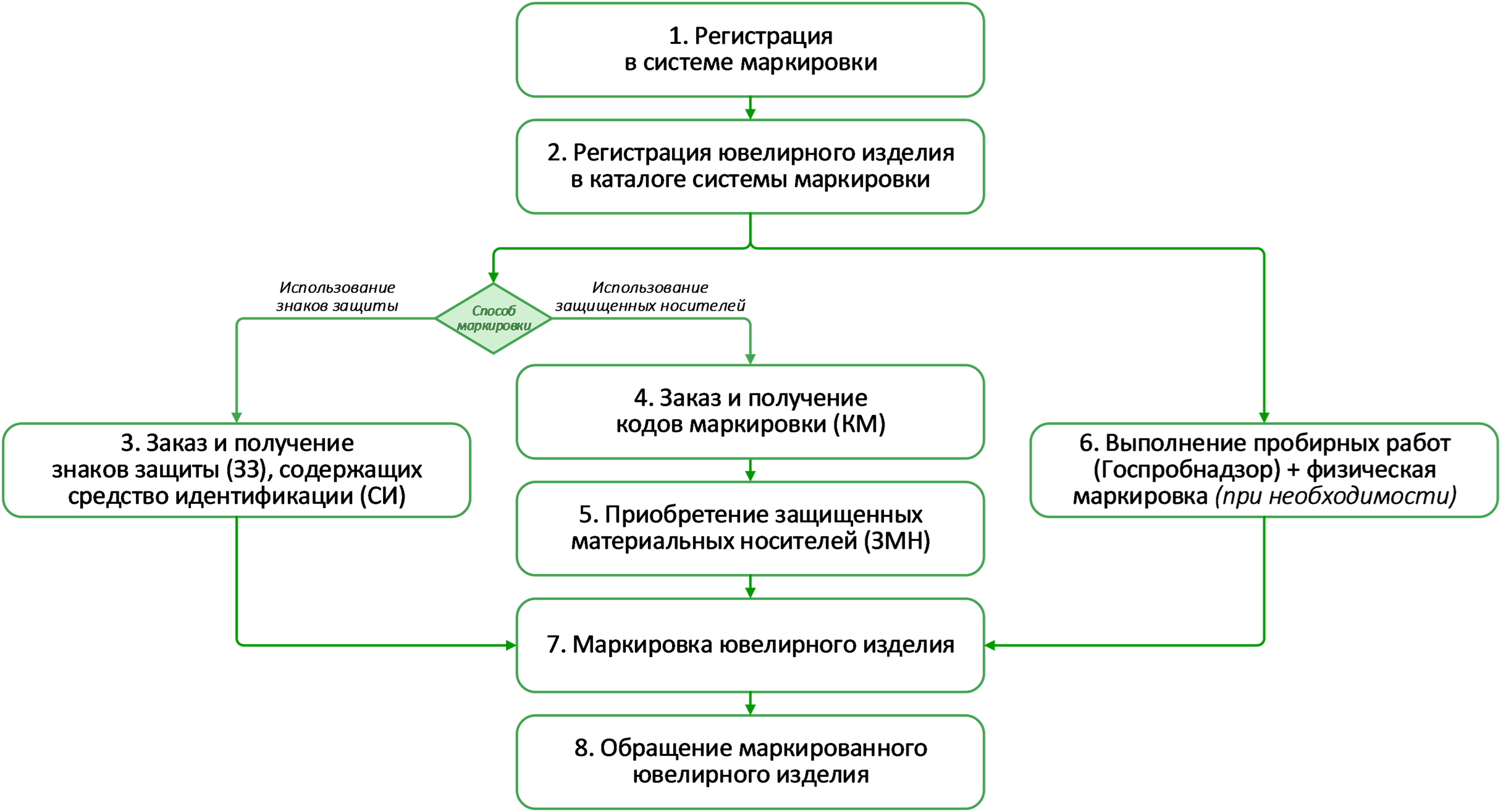 Обращение маркированных ювелирных изделий, а также оборот кодов маркировки, средств идентификации и знаков (защищенных материальных носителей и знаков защиты, содержащих средство идентификации) включает следующие этапы:
